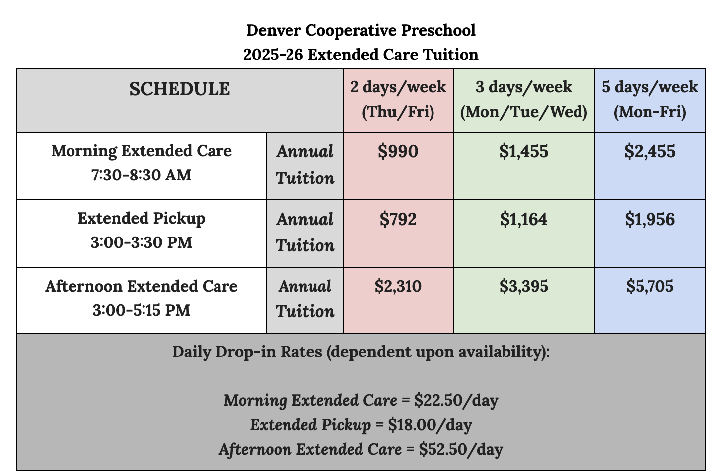 DCP offers extended care for all currently enrolled students. Families may request permanent spots (if they know they will consistently need their child to attend extended care on set days) or they may request drop-in spots when space is available.